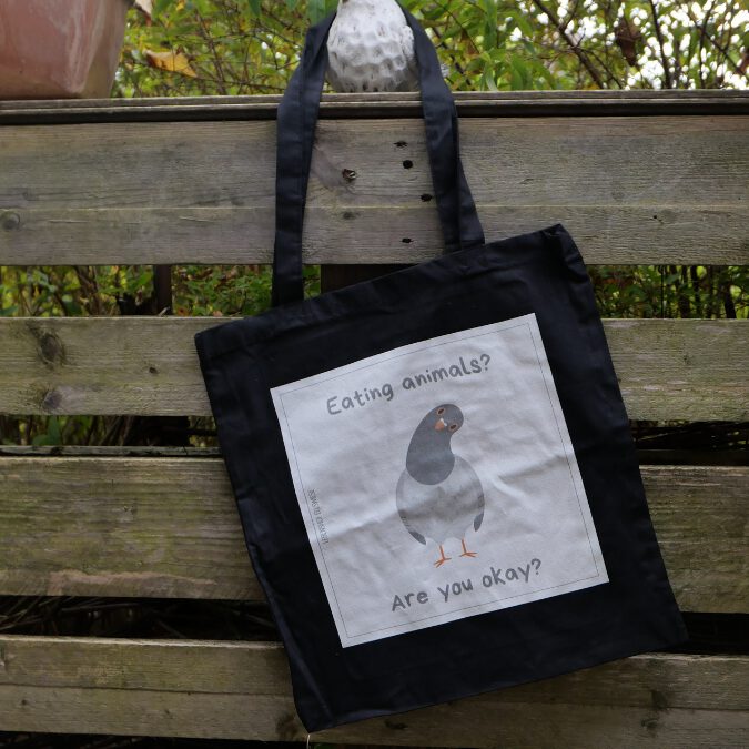 Das liebevoll gestaltete Motiv zeigt eine Taube und die Frage „Eating animals? Are you okay?“.